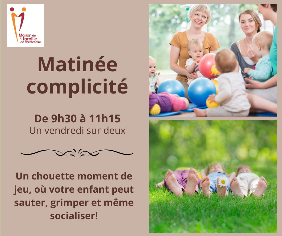 En alternance avec le Parent Causerie, les Matinées Complicité ont lieu tous les 2 vendredis, de 9h30 à 11h15. C’est l’occasion pour les enfants de socialiser entre eux; pour les parents, c’est l’opportunité d’avoir un moment de jeu privilégié avec leur petit coco, et de rencontrer d’autres parents qui vivent une réalité semblable à la leur.