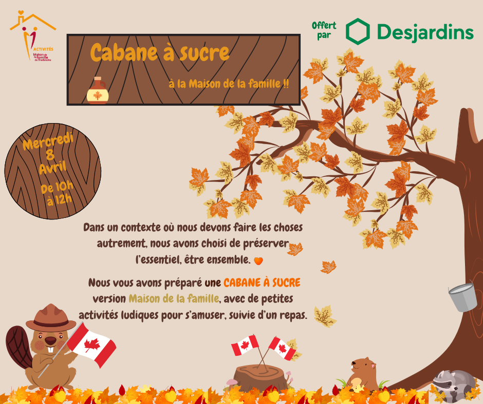 Nous vous avons préparé une CABANE À SUCRE version Maison de la famille, avec de petites activités ludiques pour s’amuséer, suivi d’un buffet pour « se sucrer le bec ».